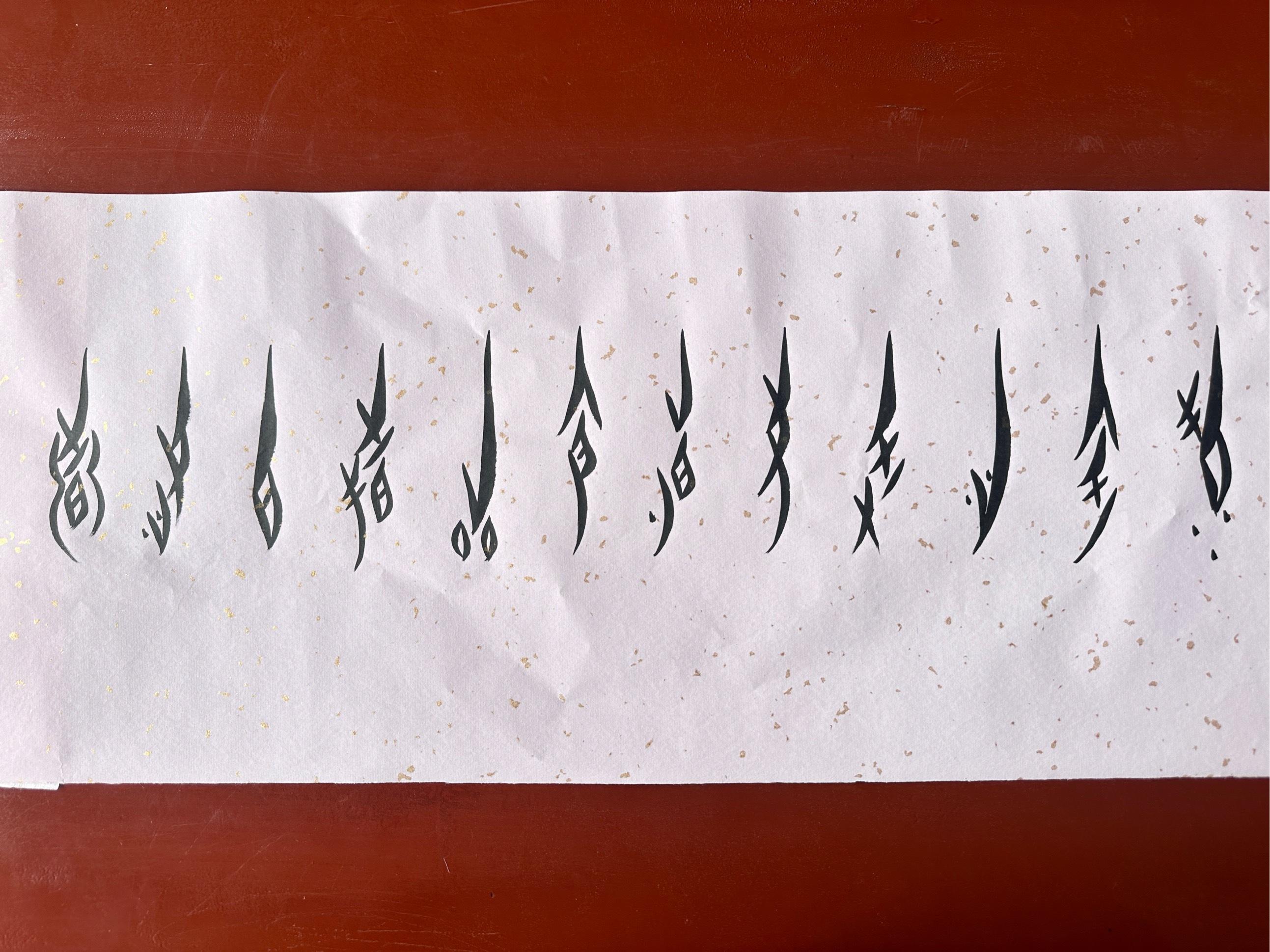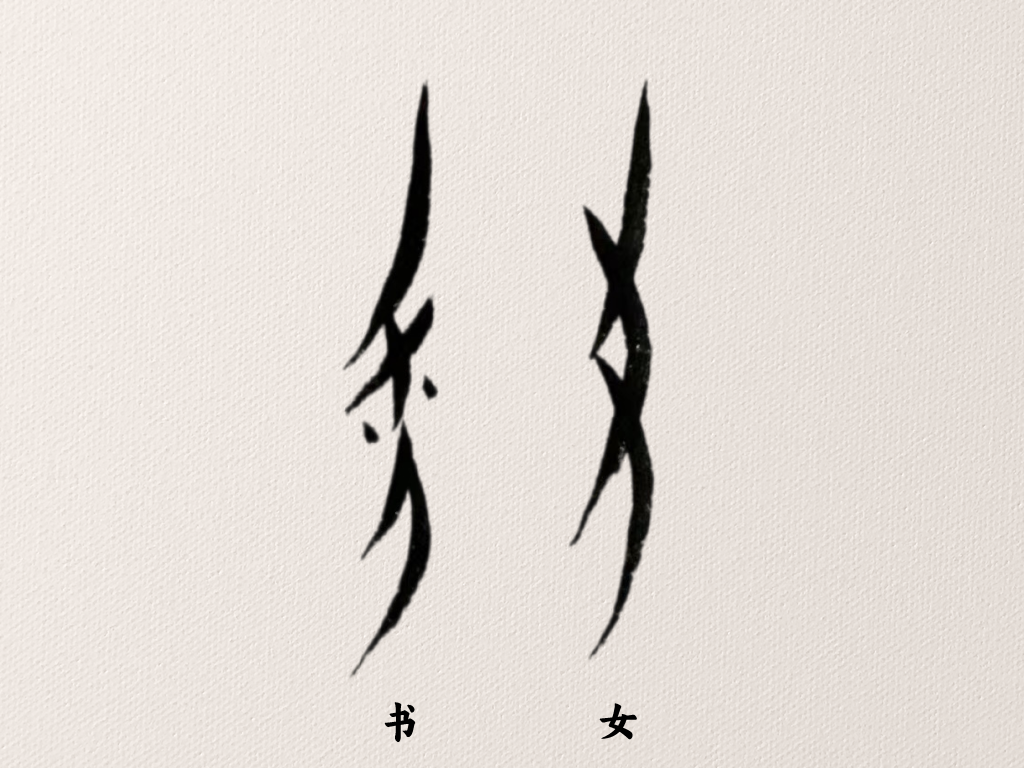 5·字形奇特:右高左低,呈长菱形;四个笔画:点、竖、斜、弧;多为七字韵文,五字的女书极其少见