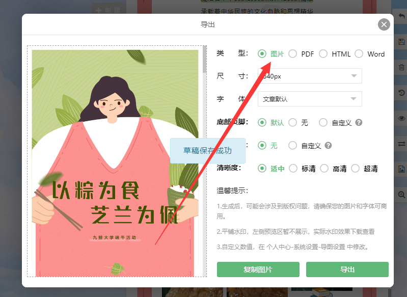 这里可以选择导出类型,一般文章建议导出为图片类型即可,这样以图片的形式再发布或群发出去就是我们使用的其他字体的文章的,而且导出还有一个优点就是文章复制到公众号不会有错乱的问题