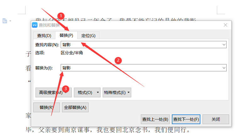 这是弹出一个对话框,我们先选择“替换”,然后再在查找内容中输入“背影”,同样,因为我们只是改字体,所以替换为还是“背影”,如图所示: