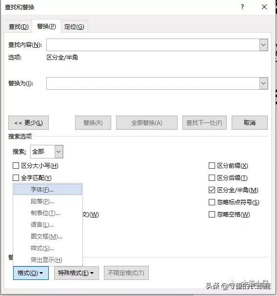 然后在【替换为】处点击填写框,然后点击左下角的更多,然后选择【格式】——【字体】。