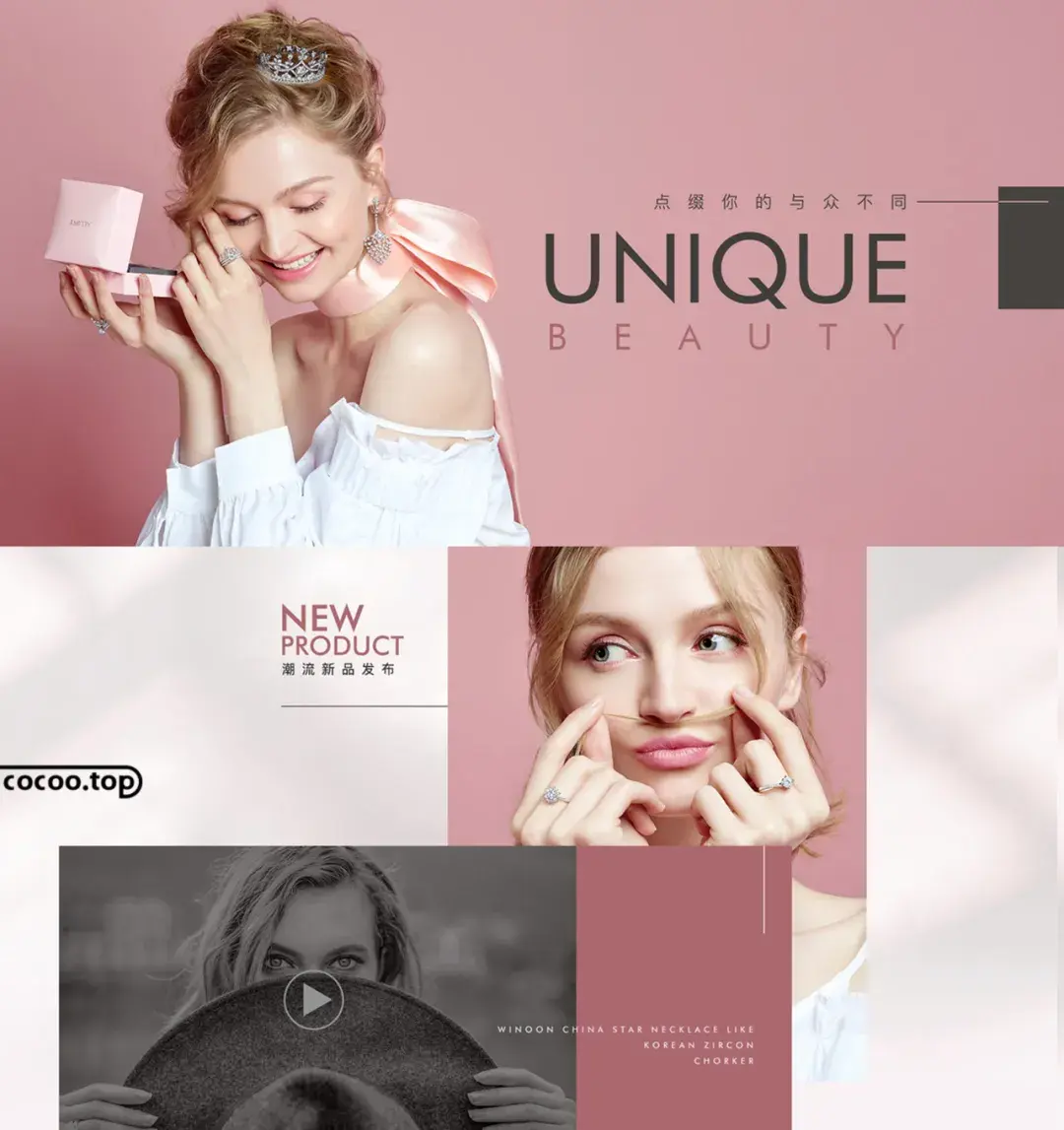 女性产品促销海报通常文字内容不多,大多数都是通过产品图和核心图吸引浏览者的注意。女性产品的海报一般不会使用粗大的字体,这样不能体现出女性的魅力,所以说字体的选择也是海报整体设计的重要元素之一。