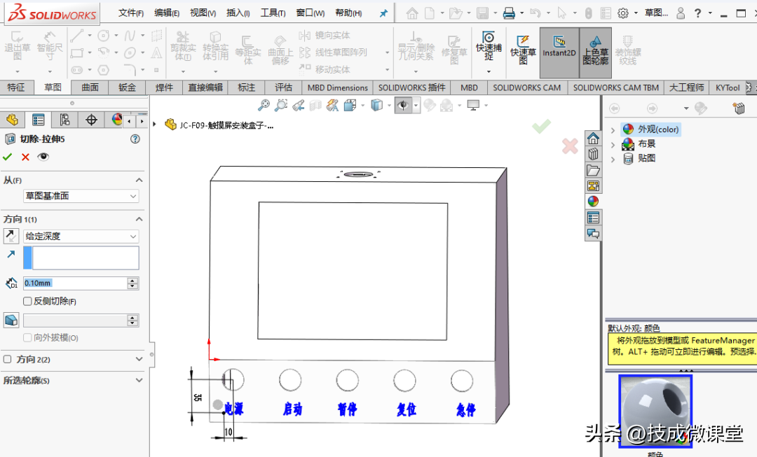 4、最后用拉伸切除命令切除0.1mm即可完成文字