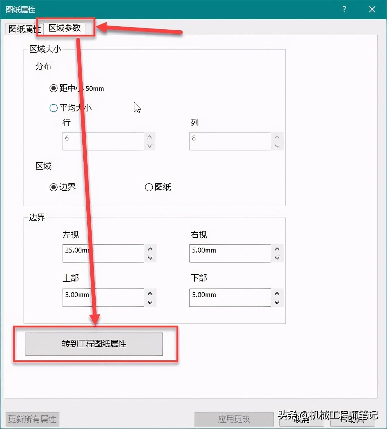 7.打开属性后单击区域参数,并单击转到工程图纸属性: