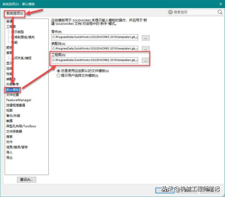 2.然后单击系统选项——默认模板——工程图,查看工程图模板的存放位置,记录下存放路径: