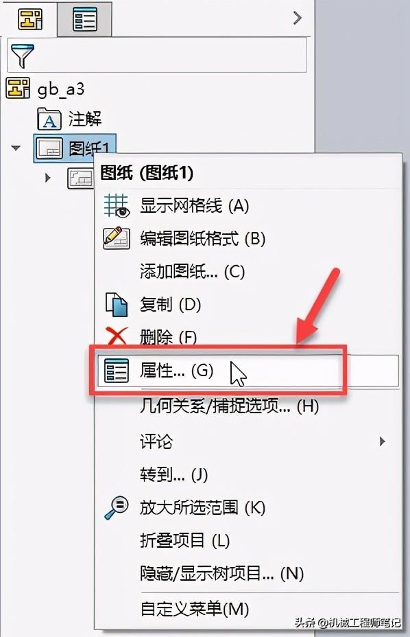 6.然后单击设计树中的图纸1,右键单击,并选择属性: