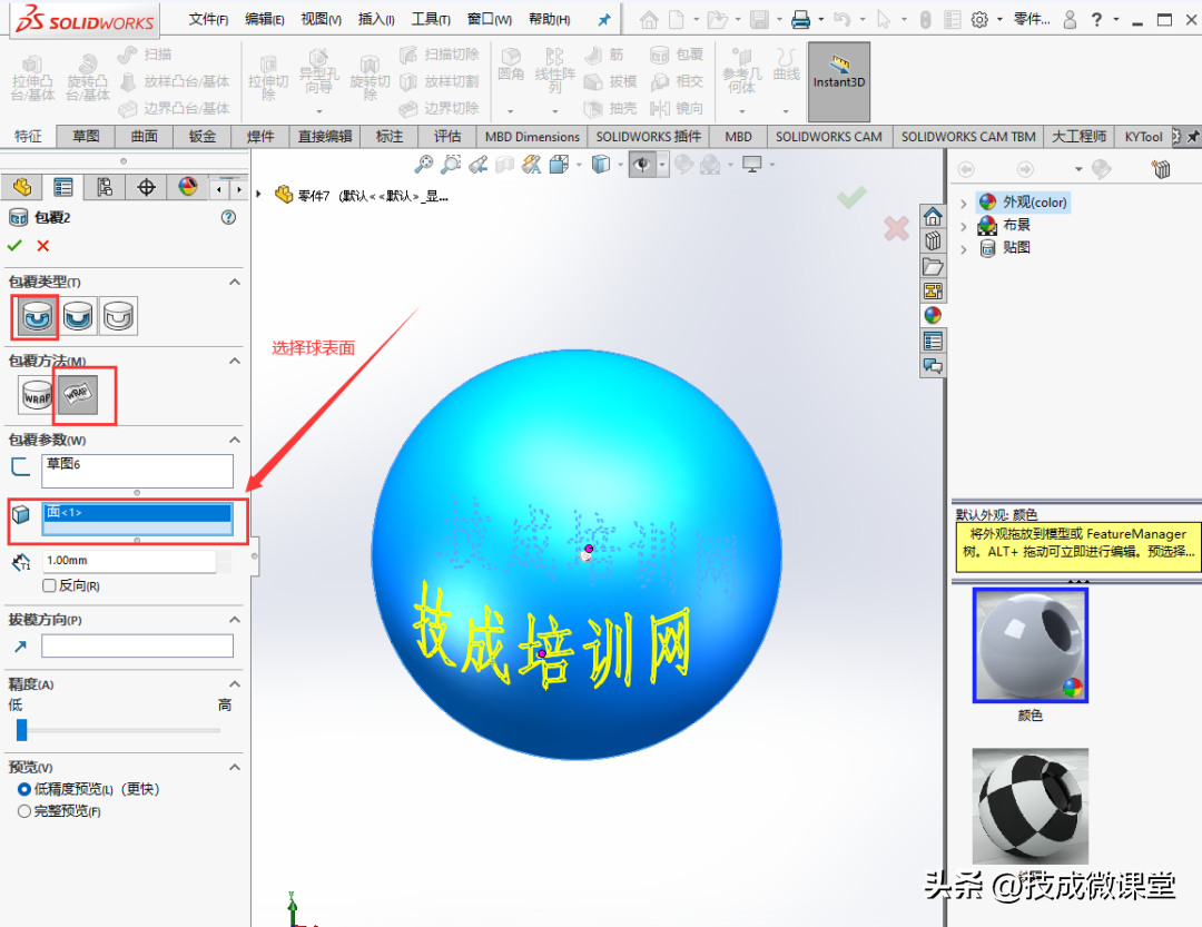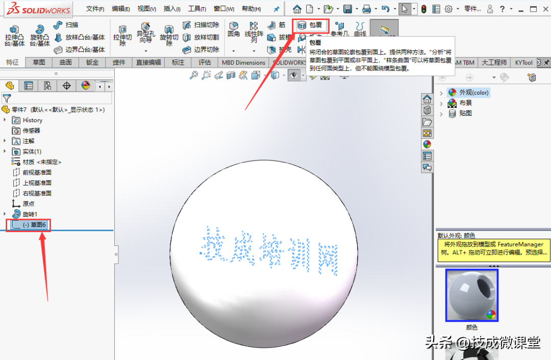 3、然后选中草图,选择特征中的包覆命令