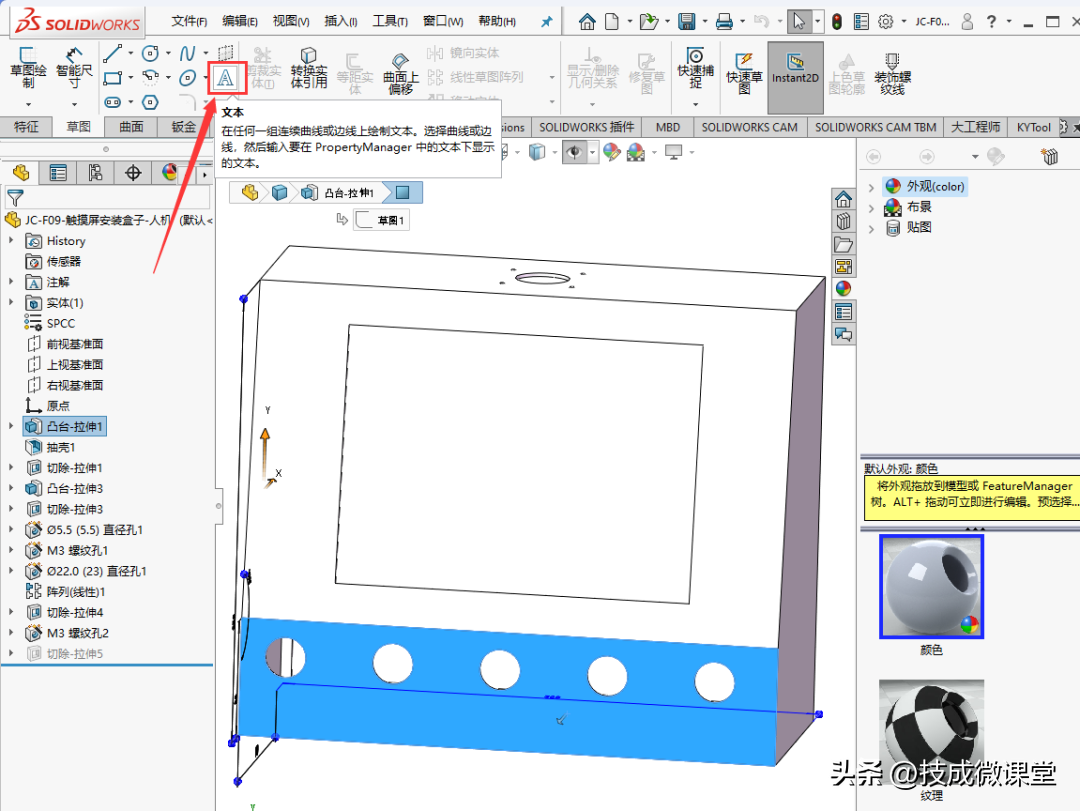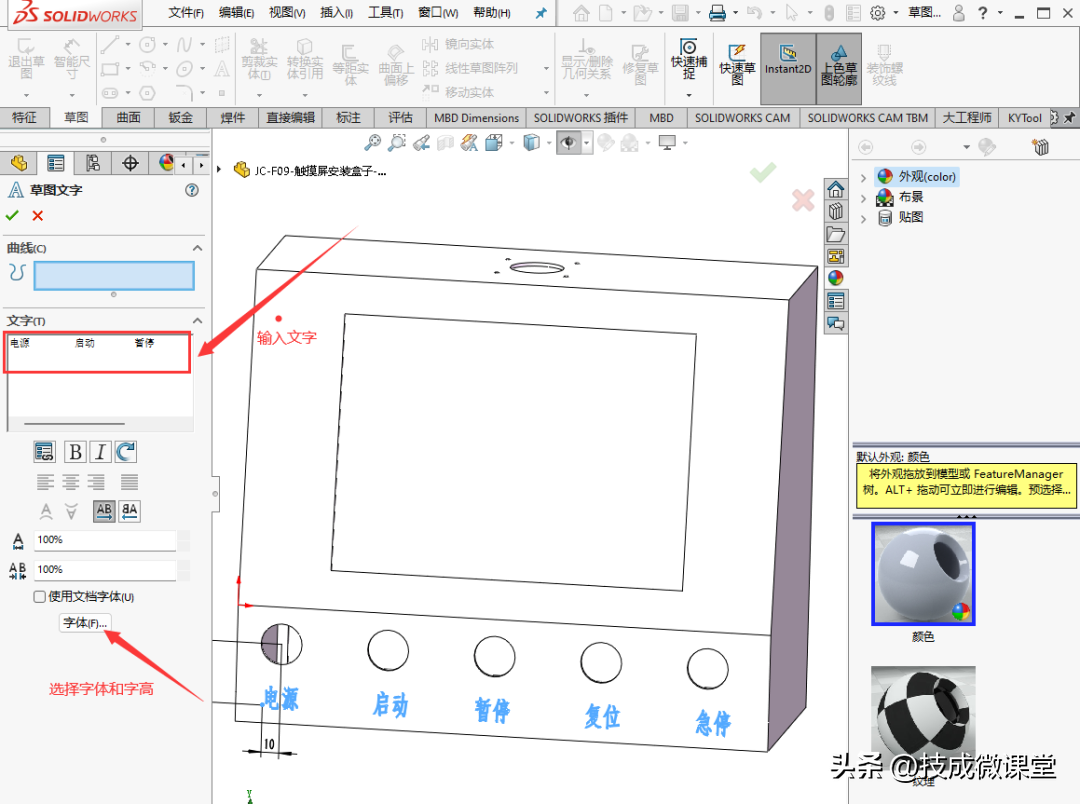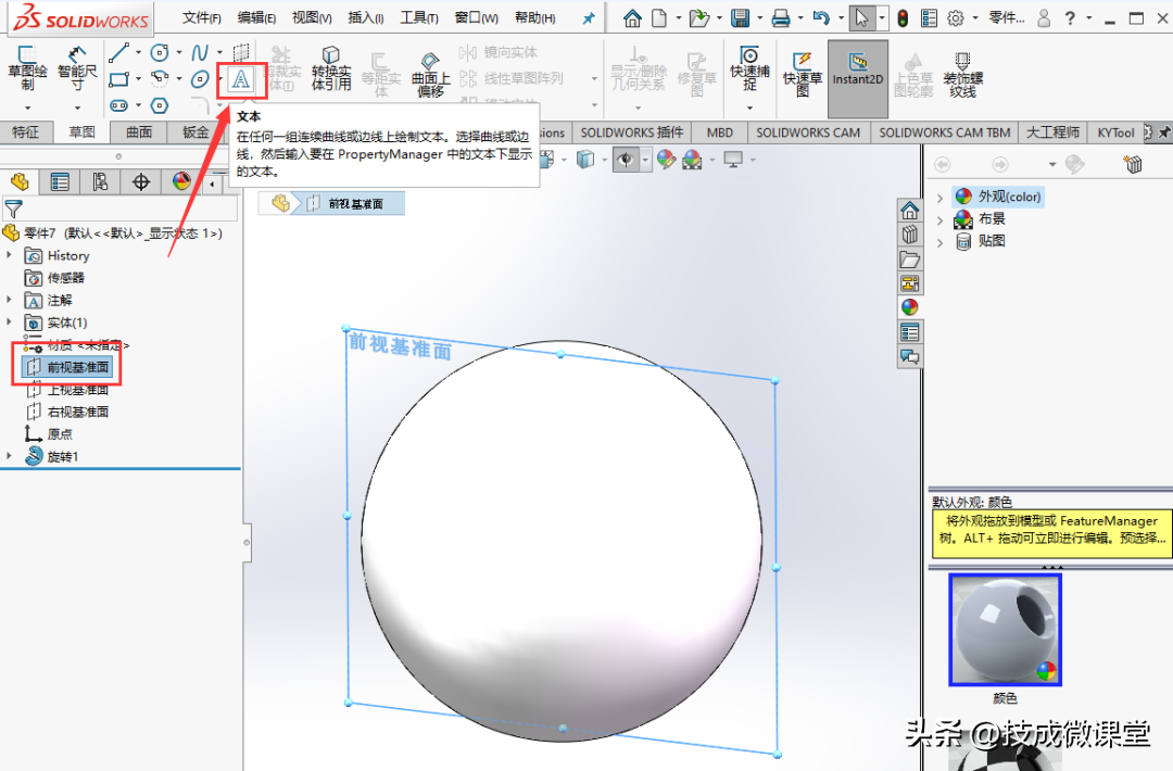 要在SolidWorks中将文字添加到实体上,您可以使用“草图文本”工具。以下是一些步骤来完成这个过程:1.在SolidWorks中打开您的零件或装配文件。2.在左...