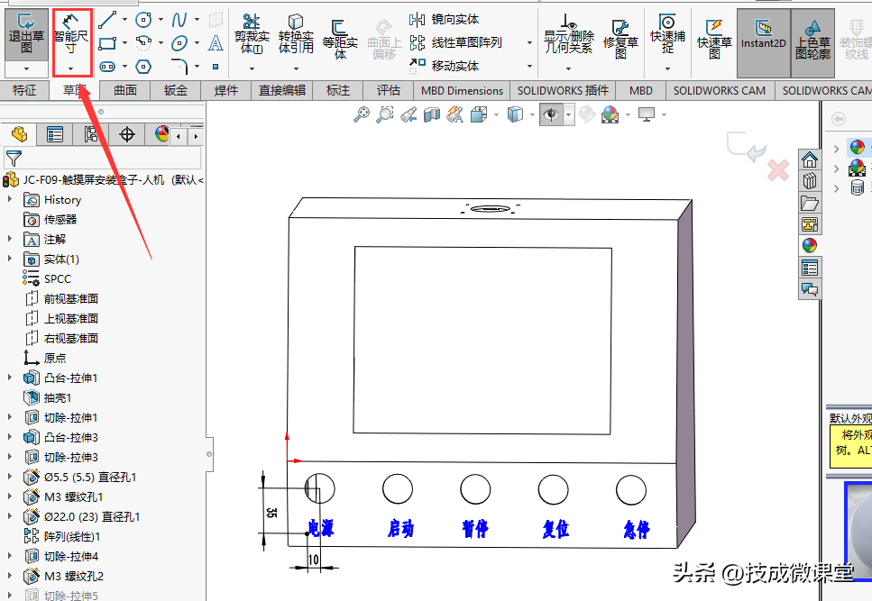 步骤如下1、在桌面上找到solidworks文件,并双击打开,打开操作面板零部件,2、选择草图特征命令,并打开文字命令3、选择基准面,将操作面板的上表面做为基准...