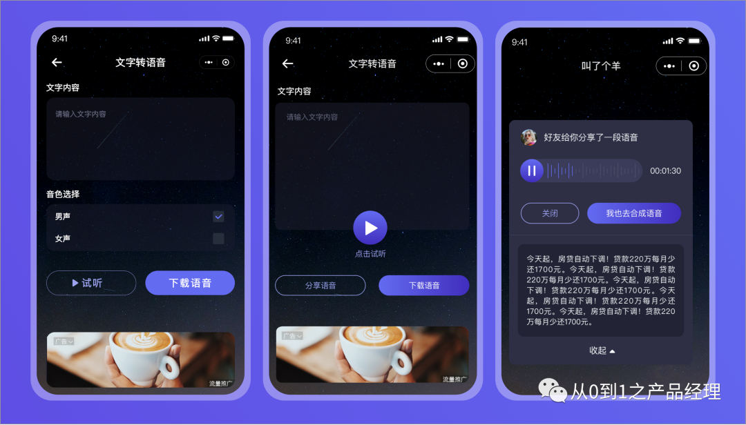 选择音色的功能由于接口方面问题,暂时摒弃了。于是重新出了UI图(如下图-左2)。开发过程中发现wx.saveFileToDisk保存到用户磁盘仅在 PC 端支持,不支持下载该类文件到手机上。于是考虑将生成的文件保存到服务器中,然后请求接口的时候返回对应的资源链接,将资源链接复制到剪切板上,由用户自行粘贴路径下载语音。思来想去,复制资源链接再去浏览器下载的操作着实鸡肋,不得不又迭代了一版:用户在小程序内生成了语音后,可以直接分享给微信好友,好友进入小程序可以直接试听(如下图-右1),同时可以获取到这条语音的文字内容。微信小程序快速便捷的轻应用模式,可以适应大部分互联网产品快速迭代、快速试错的需求,但是全部依赖于微信生态圈会有诸多限制。作为小程序的产品经理,理应熟悉微信开发规范,清楚什么可以做什么无法实现,这样在设计功能时,不会走太多弯路。