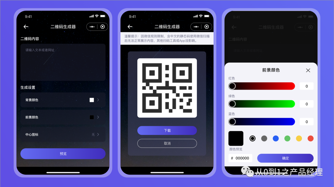 用户输入文本内容后,可以自定义二维码的前景颜色、背景颜色和中心图标,然后预览样式并下载二维码。