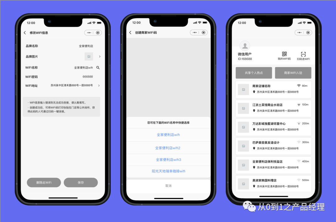 主要目标用户定位小商圈内的商家,商家入驻后填写店内的WiFi信息(计划增加WiFi地址信息),当用户进入这个商圈,可以搜索到当前定位附近所有入驻过的WiFi信息,如果位置距离在可连接范围内,则可以一键连接成功。