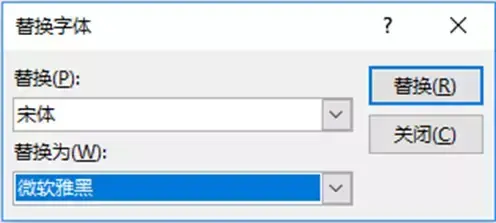 选择之后,点击【替换】就可以将整个PPT的所有使用「宋体」的文字变成「微软雅黑」啦~