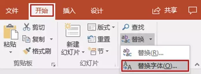 我们可以利用 PPT 自带的【替换字体】功能快速实现,在菜单栏选择【开始】-【替换】-【替换字体】。