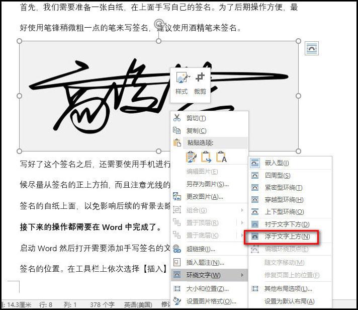 在签名图片上点右键,找到【环绕文字】并将其设置为【浮于文字上方】。