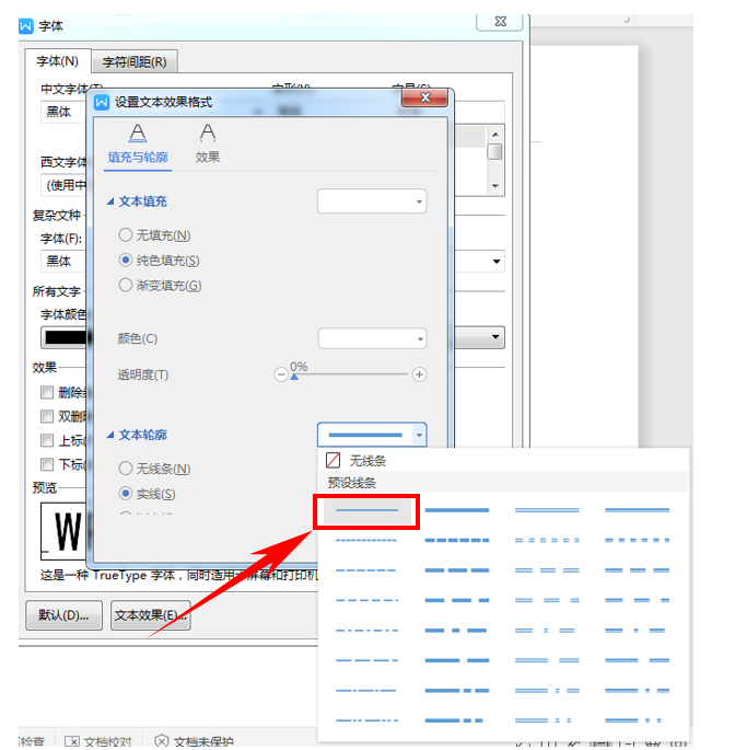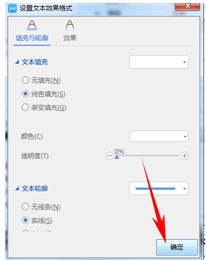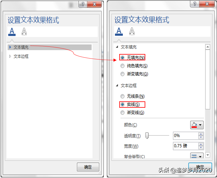 同时,在设置文本效果格式对话框中选择文本轮廓,选择实线: