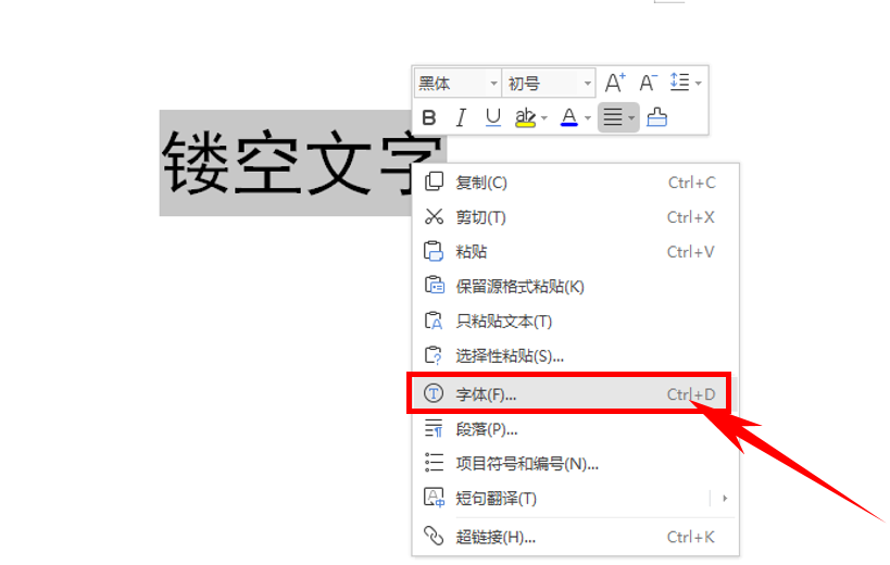Word 中如何设置镂空字体,首先选中字体,鼠标右键点击——字体: