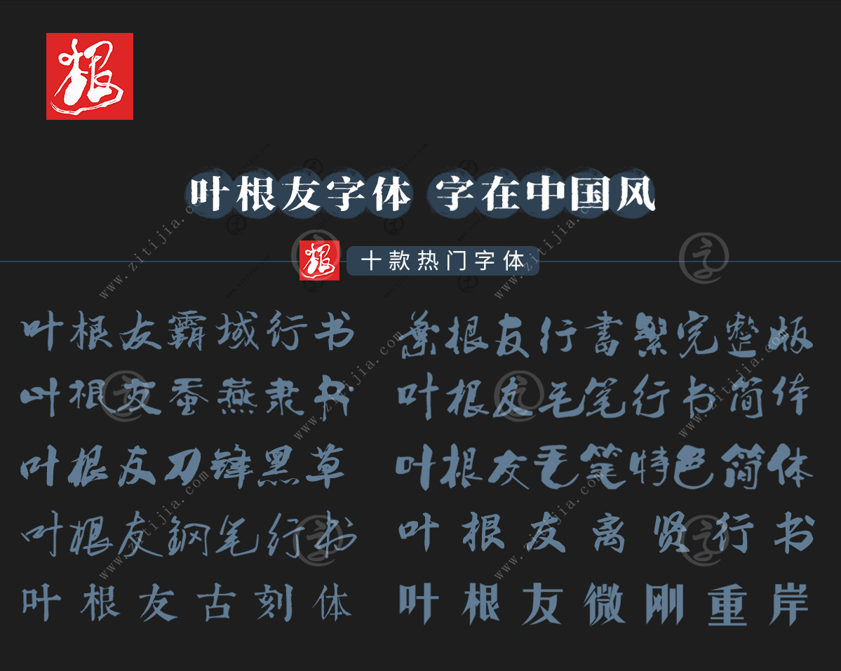 叶根友字体起始于2007年,定位手写体,经过十年的发展,已达150多套风格各异的手写体和印刷字体,目前已经成为设计师必备字体,成为字体界继方正、文鼎、汉仪后的一匹黑马。 其中“叶根友疾风草书”、“叶根友刀锋黑草”、“叶根友蚕燕隶书” 深受设计师喜爱。
