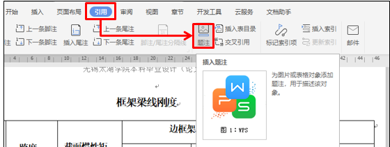 我们就可以利用在WPS文字中插入题注的方法来对这两个表格进行标注,首先,我们将鼠标放在要添加标注的位置,选择引用菜单下的题注工具,如图2