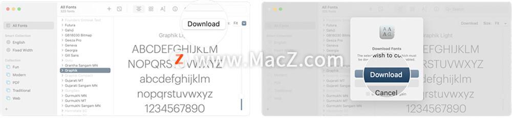 要知道的一件重要事情是,当您第一次启动 Font Book 应用程序时,您会看到一个巨大的字体名称列表——有些是灰色的,有些是黑色的。黑色字体已安装在您的 Mac 上,而灰色字体需要下载。