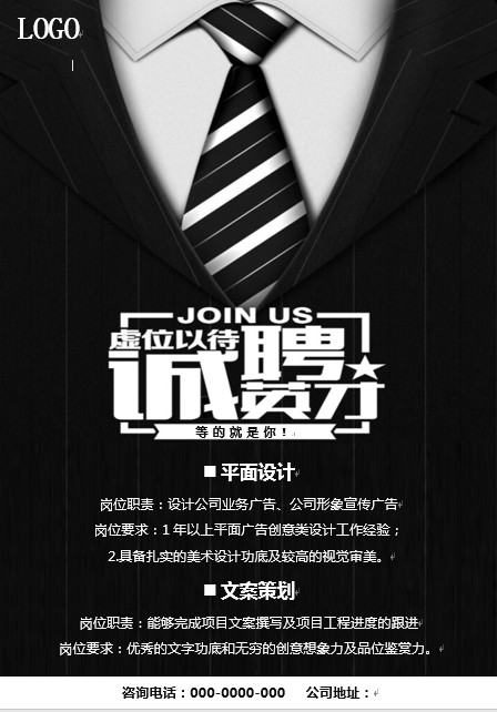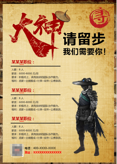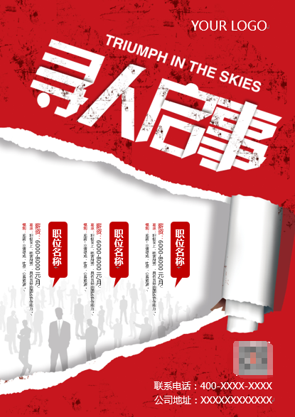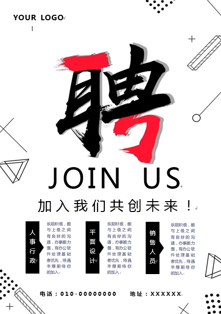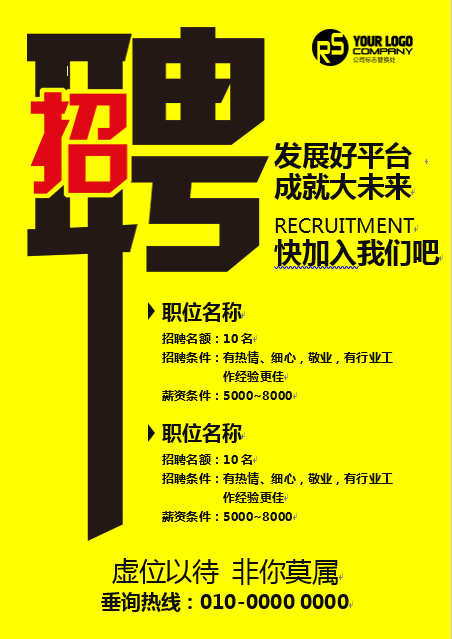 文字上注明公司名,招聘岗位,以及待遇就可以,再写上联系电话即可。比如:?某某公司?招:销售代表?五险,节日福利,带薪年假,年终奖联系电话:123123123...