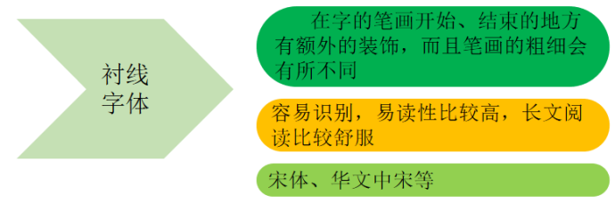衬线字体:容易识别,它强调了每个字母笔画的开始和结束,因此易读性比较高,无衬线字体则比较醒目。在整文阅读的情况下,适合使用衬线字体进行排版,易于换行阅读的识别性,避免发生行间的阅读错误。