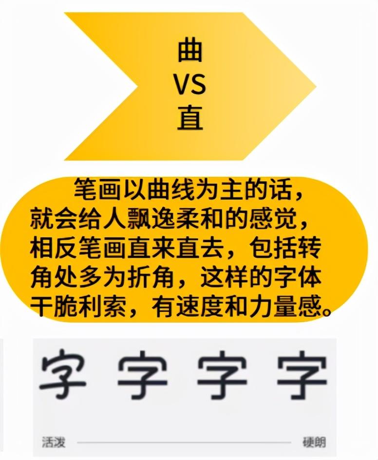 (4)曲VS直:笔画以曲线为主的话,就会给人飘逸柔和的感觉,相反笔画直来直往,包括转角处多为折角,这样的字体干脆利索,有速度和力量感。