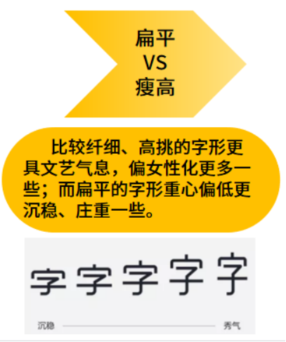 (1)扁平VS瘦高: 比较纤细、高挑的字形更具文艺气息,偏女性化更多一些;而扁平的字形重心偏低更沉稳、庄重一些。