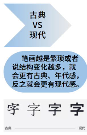 (5)古典VS现代:也称为繁与简,这里所说的简与繁并不是简体与繁体,而是笔画细节的复杂程度。笔画越是繁琐或者说结构变化越多,就会更有古典、年代感,反之就会更有现代感。