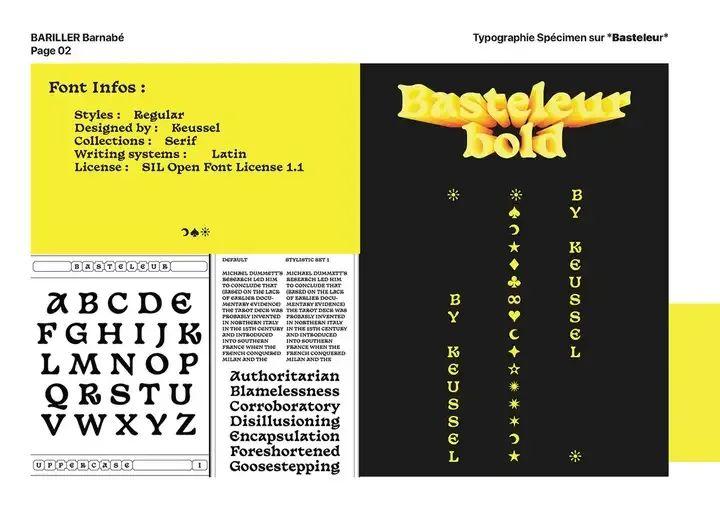 「Basteleur」是一款可锐利可柔和的英文衬线字体,拥有有两种字重 moonlight 与 black,两者相比,moonlight 字型更偏尖锐化,而 black 字型的整个风格会更加圆润、柔和, "m"、"Y "或 "R"的对比会更加明显。这款字体可用于标识、文本、封面、海报等较有设计感的场景上。