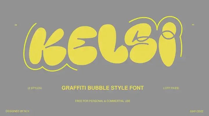 Kelsi 是意大利设计师 Misha Vlasov 设计的一款免费的涂鸦泡沫风格字体,这款字体外形胖乎乎的,十分可爱。Kelsi 拥有肥硕的外形,轮廓线圆润流畅,字体的笔画很圆很宽,从而笔画之间缝隙很小,有一种挤压的感觉。