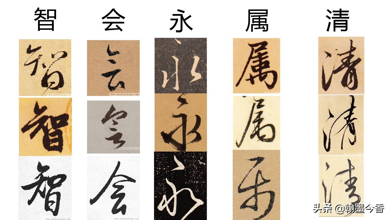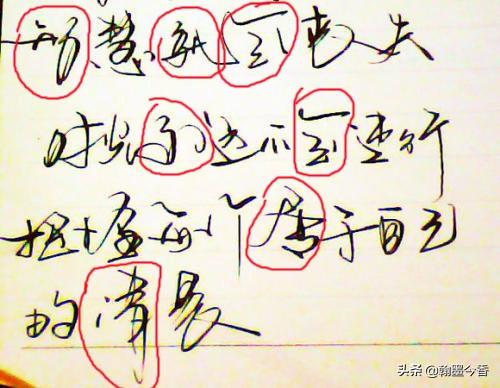 上图这幅硬笔书写的两句话,网上很多人都说写的漂亮,但为什么不能叫书法呢?前面我们说过,书法首先是要写好字,在不破坏字的结构的情况下,要写的有艺术性。而上面这个文字的书写,其中我画红圈的字,如果不是放在这句话中,单独拿出来,恐怕就没谁认识了吧。所以这连最基本的写字规范都达不到,何来更高级的书法之说。我把其中几个画红圈的字单独列出来,找了一些古代书家的写法,我们来比较一下,就能发现问题了。