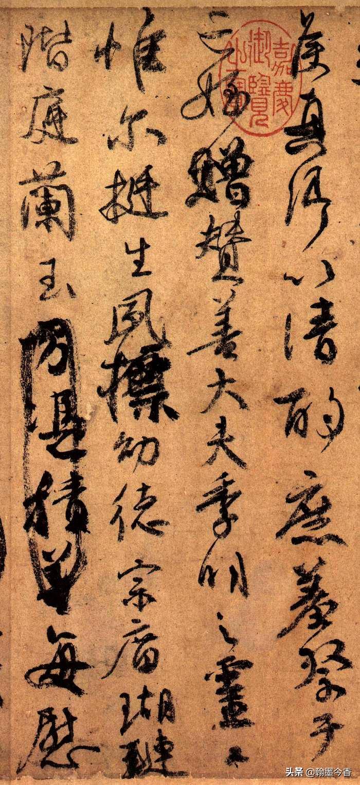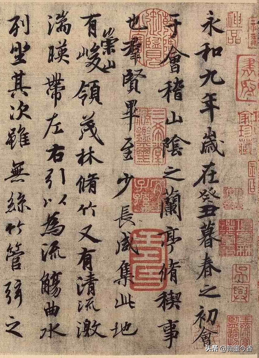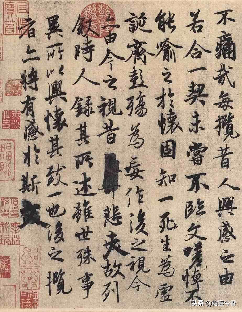 另外一点就是这幅作品的印章盖得太多了,而且还比较乱,缺少一定的章法安排,还有一方貌似盖斜了,这也是被吐槽的一个焦点,很明显,这幅作品作者在没有好的临帖功底下,自我的表现太多了,所以显得俗了,被指为“江湖体”。
