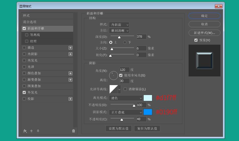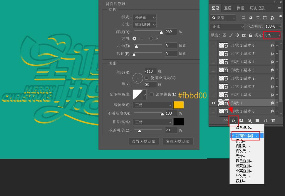 点击图层面板图层样式按钮,选择“斜面和浮雕”,然后设置,参数如下图,确定后把填充改为0%。
