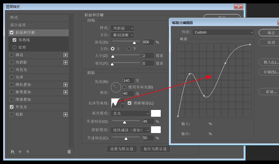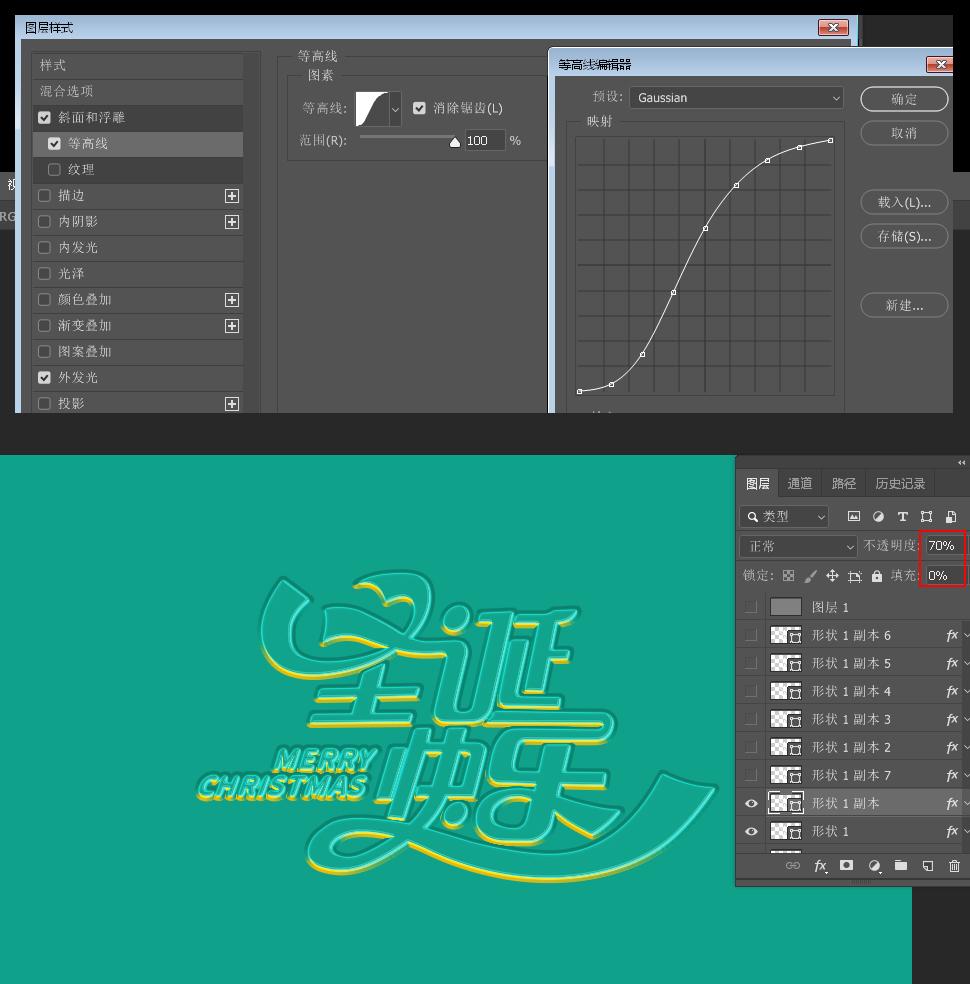 同样的方法给“文字副本”图层设置图层样式,分别设置:斜面和浮雕,等高线,参数如下图。确定后把图层不透明度设置为70%,填充设置为0%。