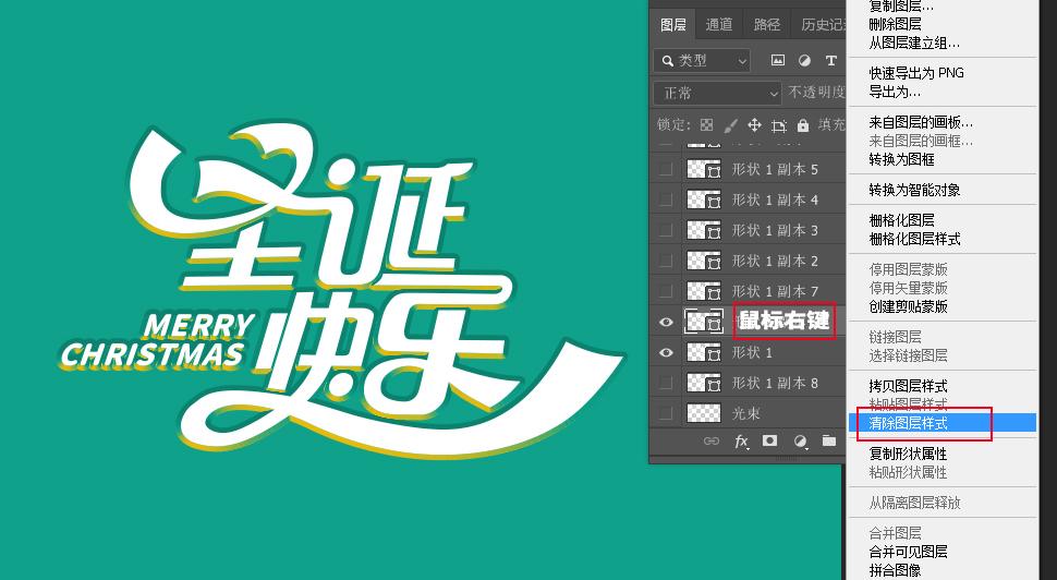 按Ctrl + J 把当前文字图层复制一层,然后图层文字副本缩略图后面鼠标右键选择“清除图层样式”,如下图。