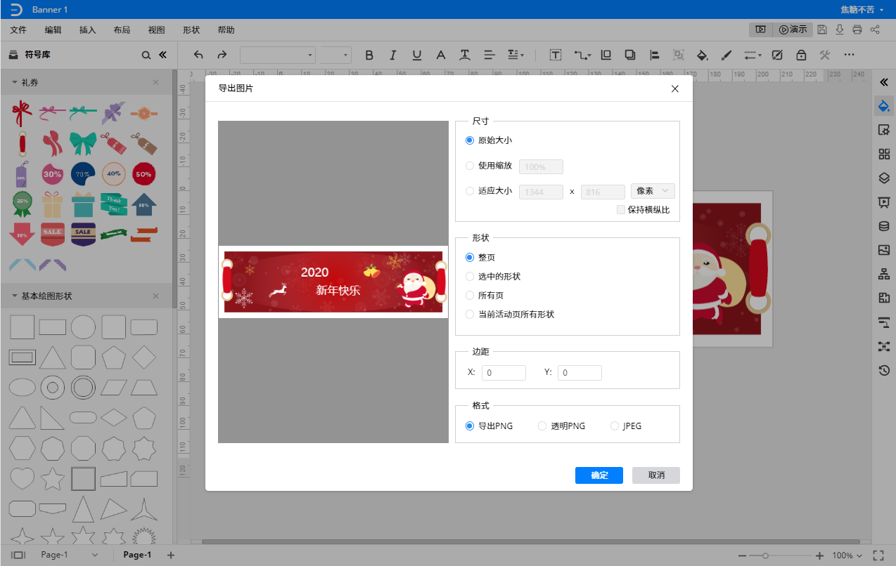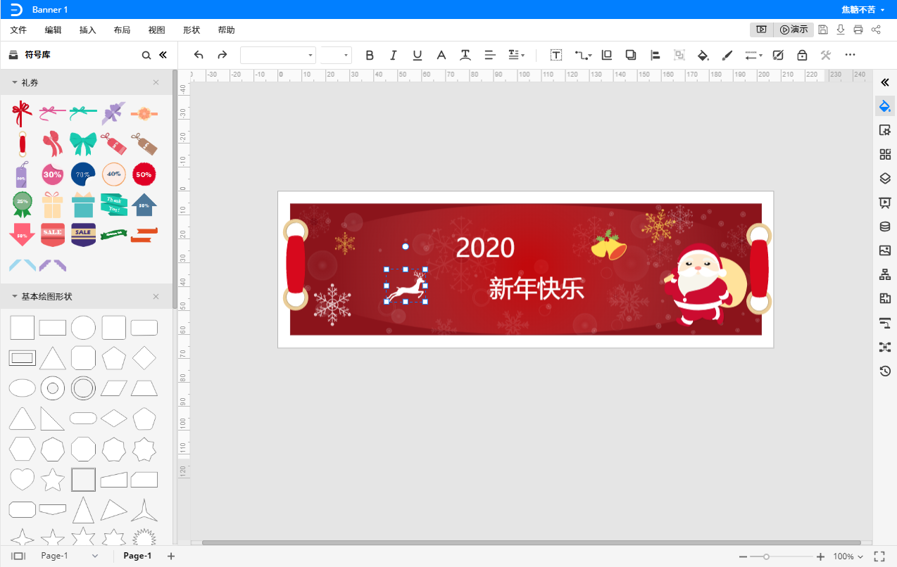 第三步:点击画布中的横幅,然后在左侧符号库中选择礼券和基本绘图形状,拖动到画布,也可以新建空白画布自行绘制。