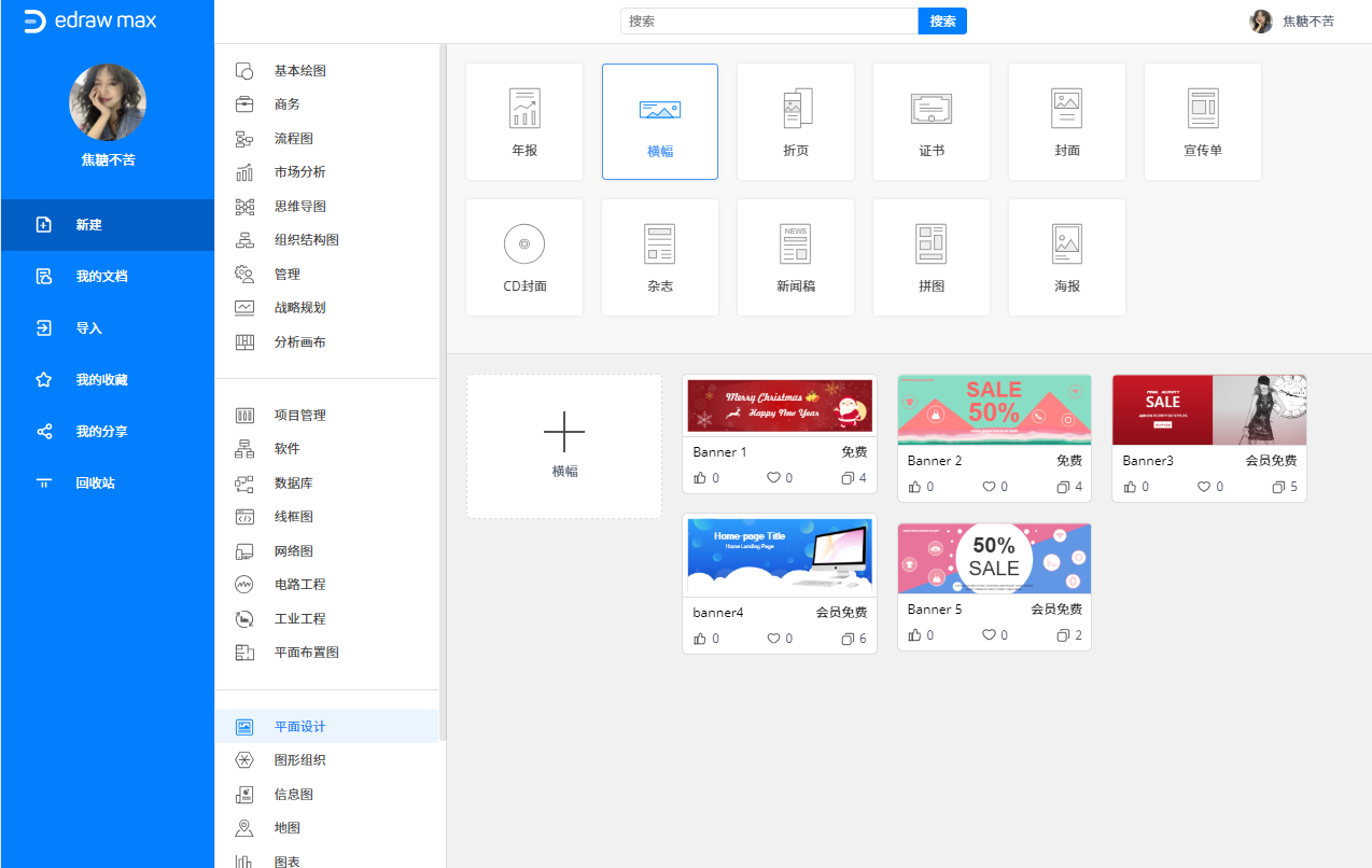 第二步:新建横幅。依次点击“平面设计”-“横幅”,然后从例子库中选择一个模板,点击打开横幅模板。