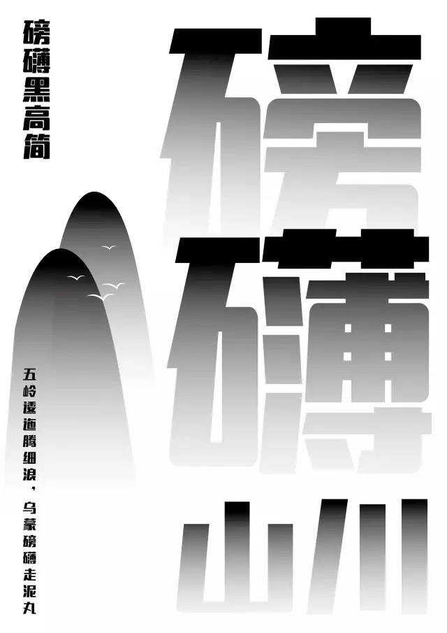 横看成岭侧成峰,“磅礴黑”实验性地采用斜体与正体的融合,左侧倾斜的手法在整体稳重大气的字形中增添少许灵动,右侧的垂直设计支撑起整个架构,形成“气势磅礴,万壑争流”之势,不禁感叹“不识庐山真面目,只缘身在此山中”。