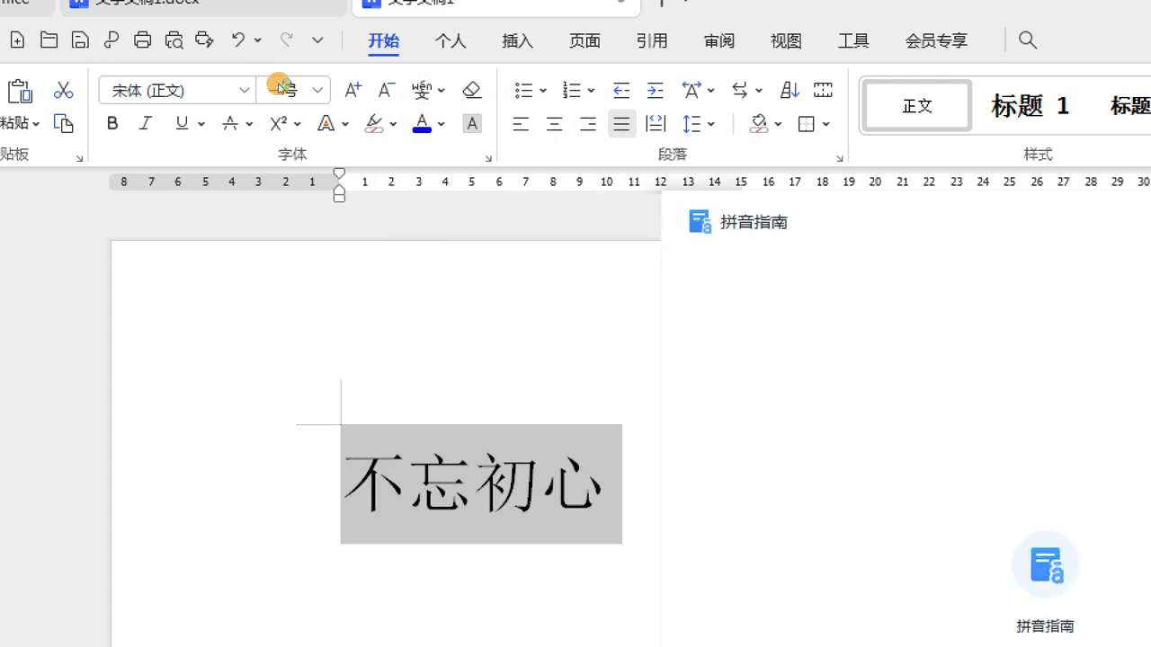·首先要选中文字,把字体放大一下。操作之前先选中文字,选中文字之后再开始功能区。在开始菜单下选择字体功能区,在字体功能区中选择a加a减,旁边有个文,这就是拼音指南的位置。