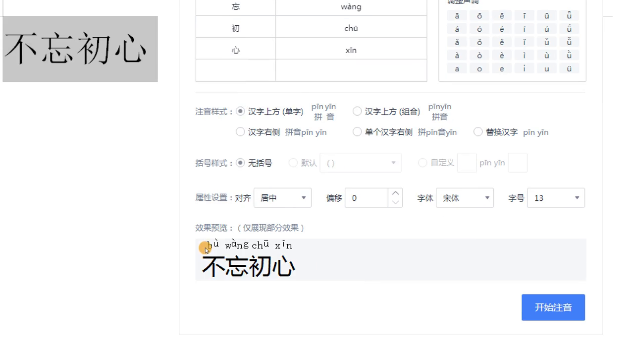 这样拼音是存在的,这字就没有了。看看效果,别的都默认不用动,点击开始注音,恢复一下不忘初心,这就是看拼音写词语的效果。放大一下,大家看清楚一下,不忘初心就给孩子制作看拼写词语,那样提单就特别实用。