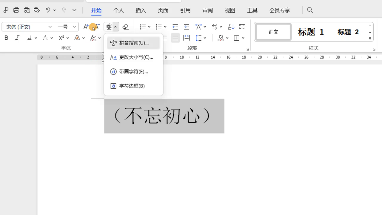 比如给单个字添加拼音,选中一个字,先选中,操作谁就选中谁。在开始菜单下选择字体功能区旁旁边有一个拼音指南,点开,点击拼音指南。打开之后单个字的新字添加拼音,在上方添加拼音或者在右侧添加拼音看什么效果?在右侧添加拼音就让你选择有括号无括号的,比如选择有括号,这是有括号的默认,这个括号看什么样?预览是这样效果。