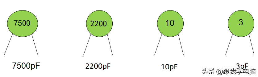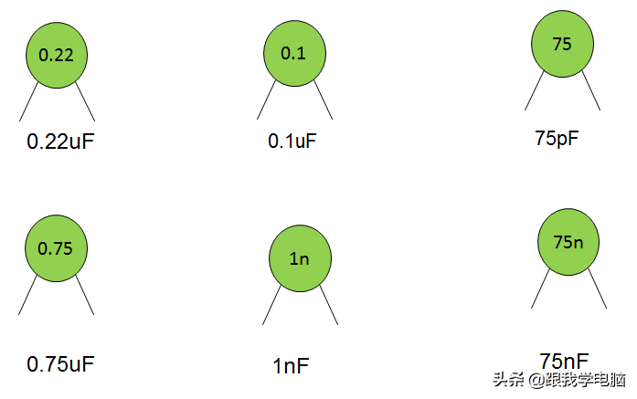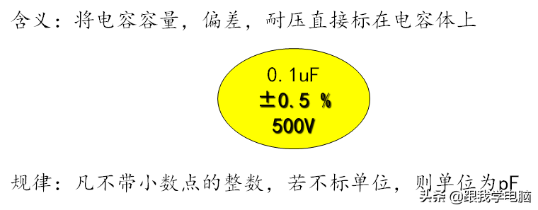 带小数点的数,不标单位,单位为uF,小型电容,耐压在100V以下的可以不标