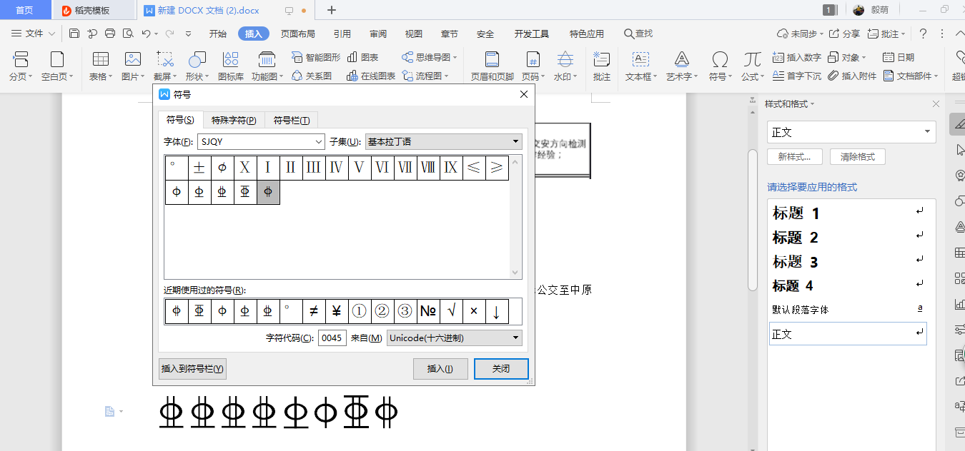 2、SJQY 字体安装成功后,这里以 WPS 为例说明,打开 WPS >> 点击插入 >> 符号 >> 其他符号 >> 符号,在字体中输入:SJQY 并回车,即可在下方看到三级钢筋符合,选择相应钢筋符号之后点击插入即可。具体如下图所示: