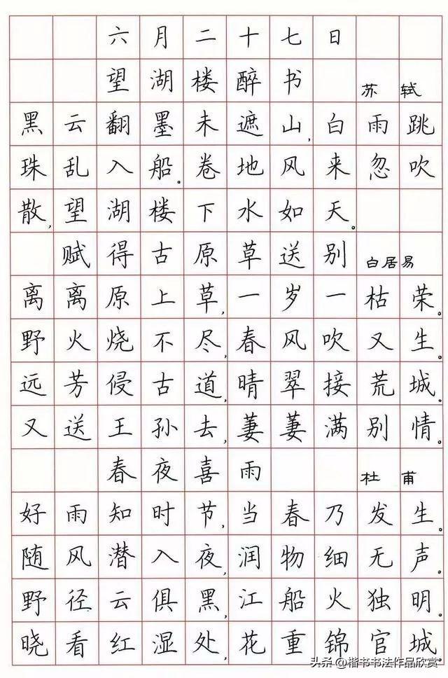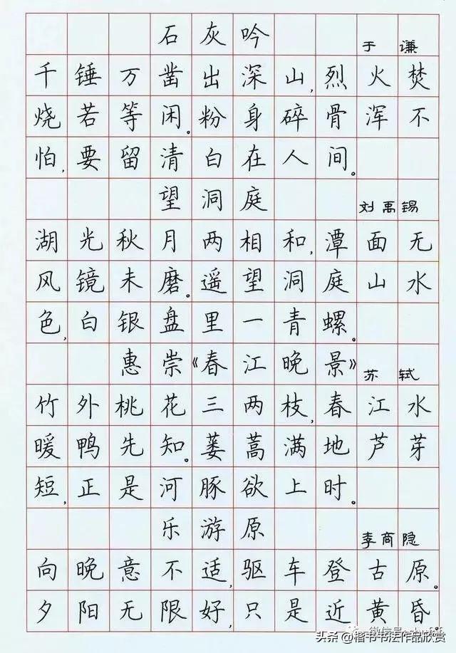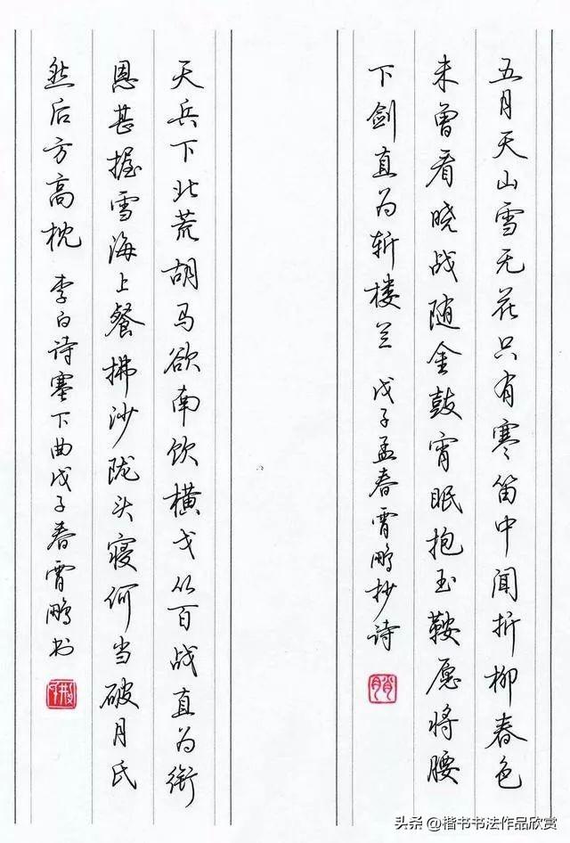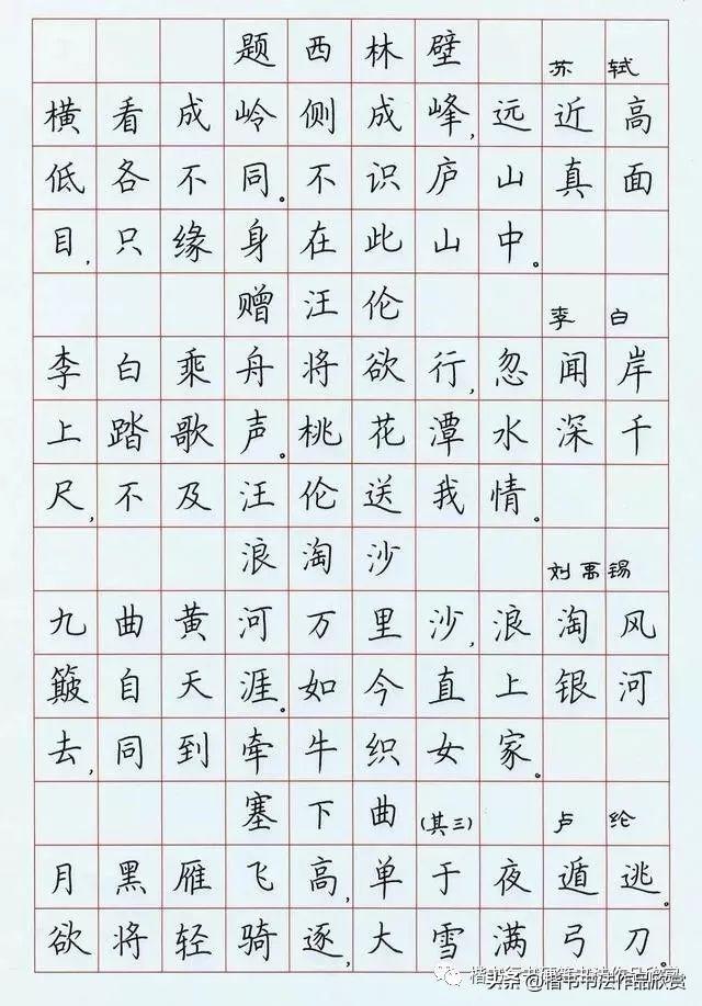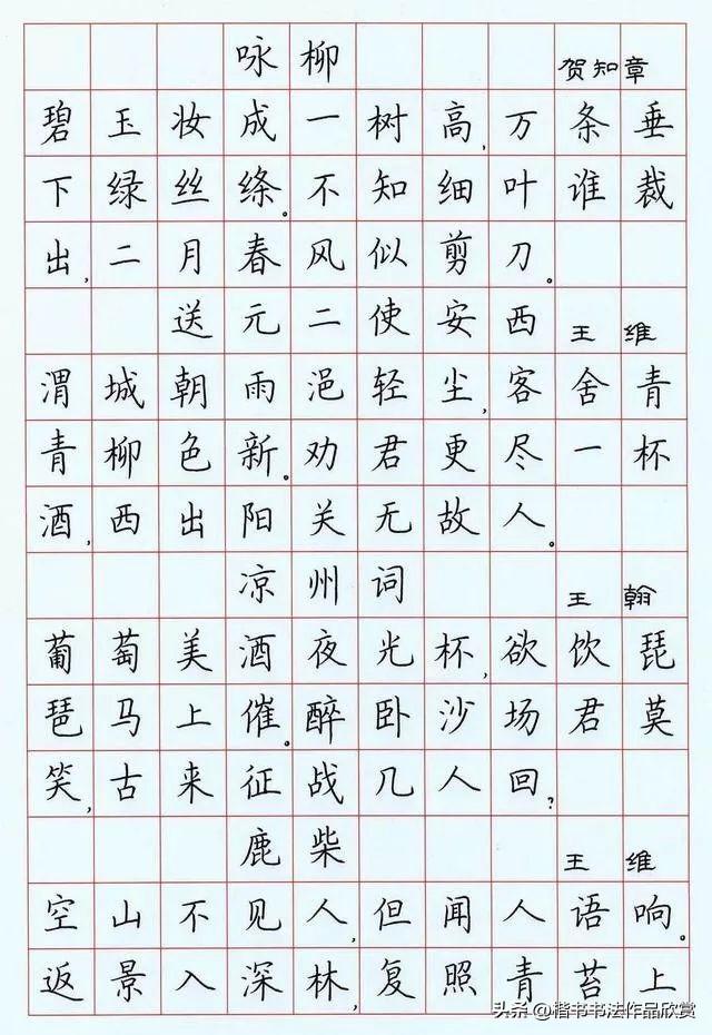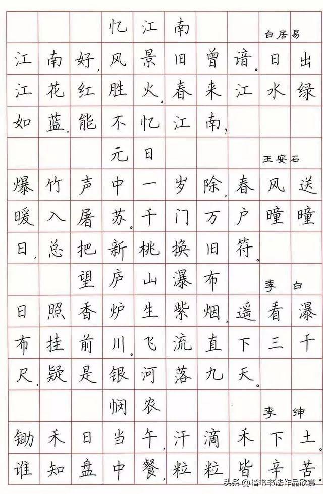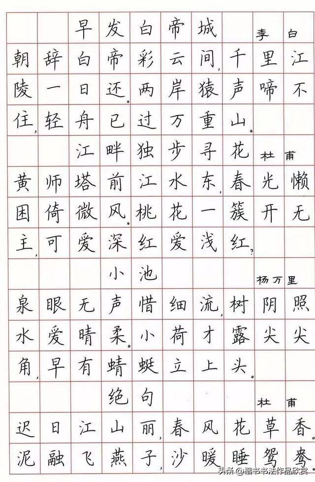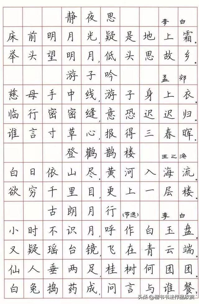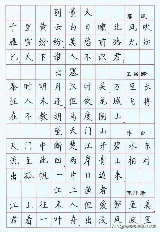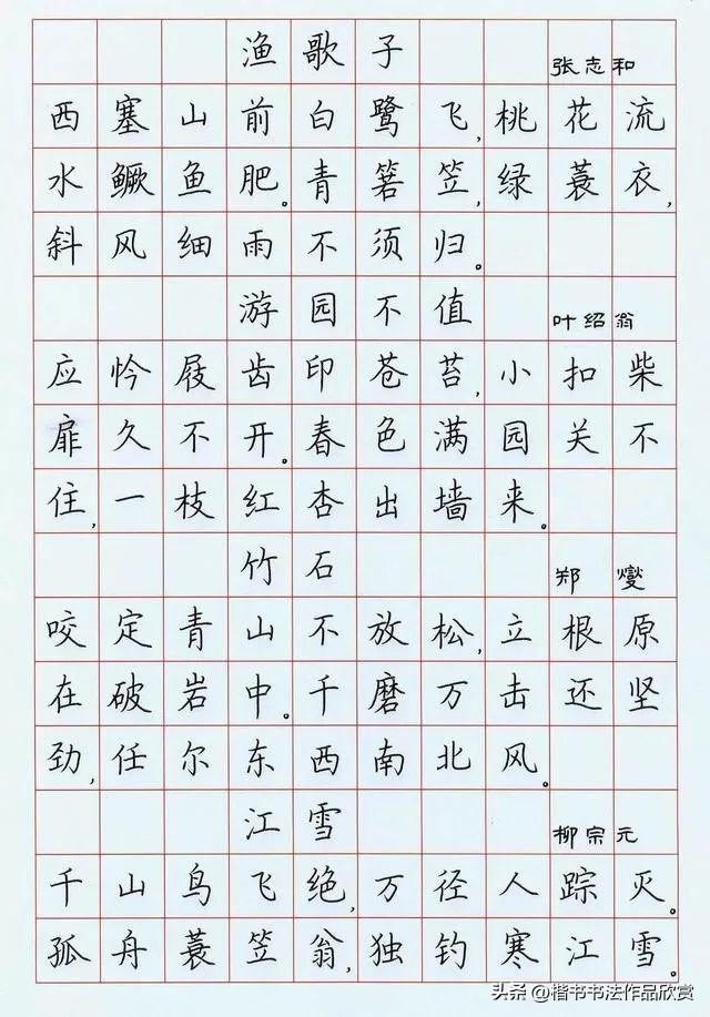荆霄鹏老师的规范字作品,荆霄鹏老师曾编写九年义务教育《写字》书本,实力可谓强悍,规范字的书写那肯定更是一绝,第一次看到这个字的时候,还真有点像电脑印刷的,然后仔细一看,其实每个字都有着细微的不同。不过,如果能把每个同样的字写得一模一样,那也是一种能力。许多人表示这字写得太犯规了,简直就是手上装了一台打印机。荆霄鹏老师的行楷也是一绝,有时间会继续跟大家一起欣赏,先看下面的楷书规范字作品吧。想要练习的同学可能自行保存或者收藏,这个字体在学校肯定是最受欢迎的。