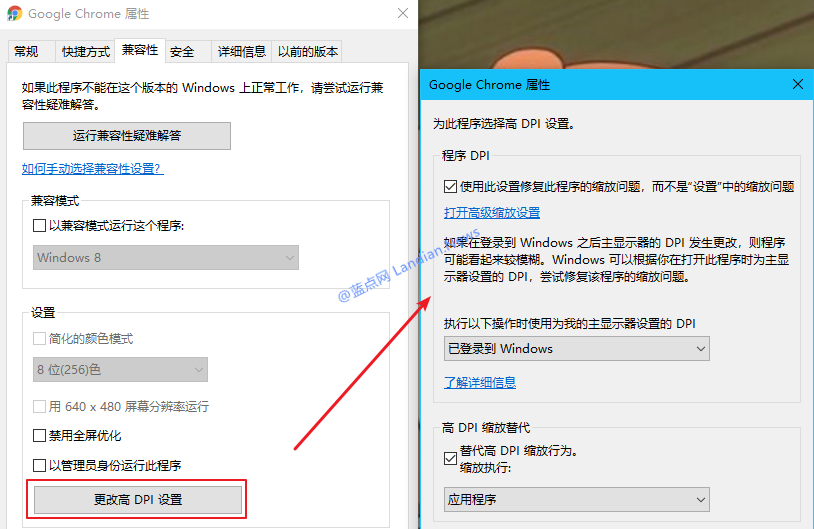 将代码添加完成后点击应用而不是确定,因为我们还要接着修改特定应用程序即谷歌浏览器的高DPI设置项。点击属性的兼容性菜单然后再点击底部的更改高DPI设置,在右图中勾选修复DPI缩放问题和替代缩放行为。
