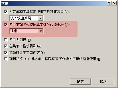 控制面板 → 显示 → 外观 → 效果 → 使用下列方式使屏幕字体的边缘平滑:清晰