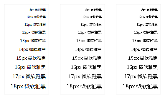 微软雅黑字体只有在使用 ClearType 技术进行渲染时,才会达到最佳视觉效果。下面的图片展示了不同情况下微软雅黑字体的渲染效果: