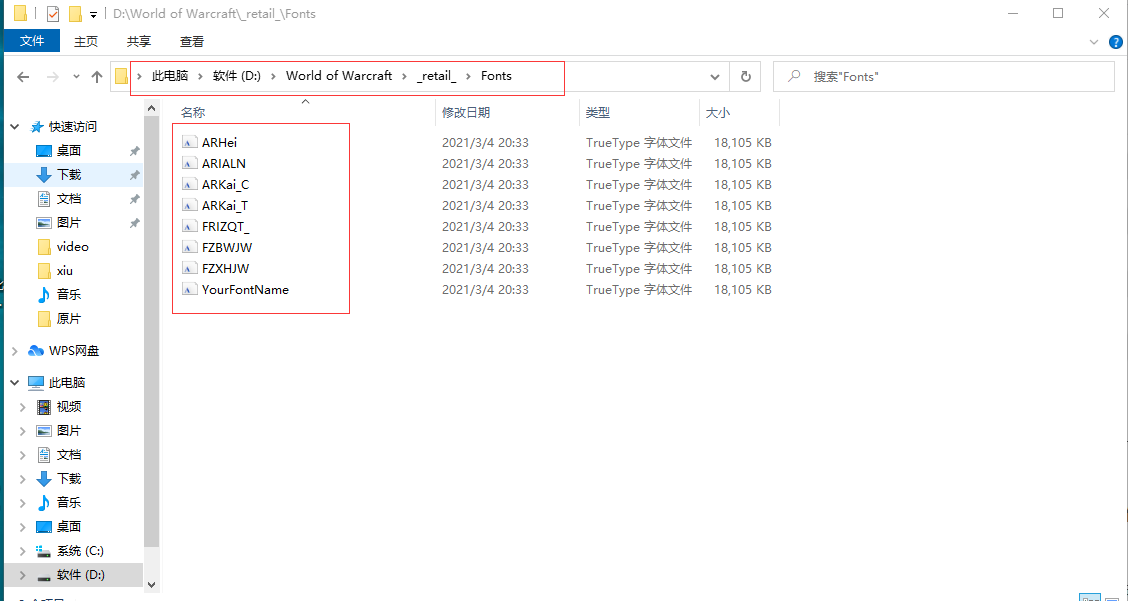 第三步:找到魔兽世界文件夹里的“Fonts”文件夹。将“Fonts”文件夹里的文件清空,然后将之前准备好的八个字体文件粘贴进去就大功告成啦~