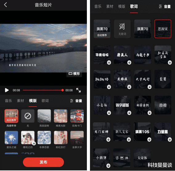 当然,“轻装上阵”不意味着放弃美感,音乐短片也能氛围感满满。在“模板”选项中,全民K歌提供了11种模板,比如浪漫唯美的“冬季恋歌”、如梦似幻的“爱乐之城”、港风十足的“旺角卡门”等等,可以满足不同风格音乐短片的氛围需求。此外,在“歌词”选项中,全民K歌提供了22种字体,有的可爱、有的飘逸、有的文艺,让不同风格的音乐短片都能拥有与其相得益彰的“灵魂注脚”。