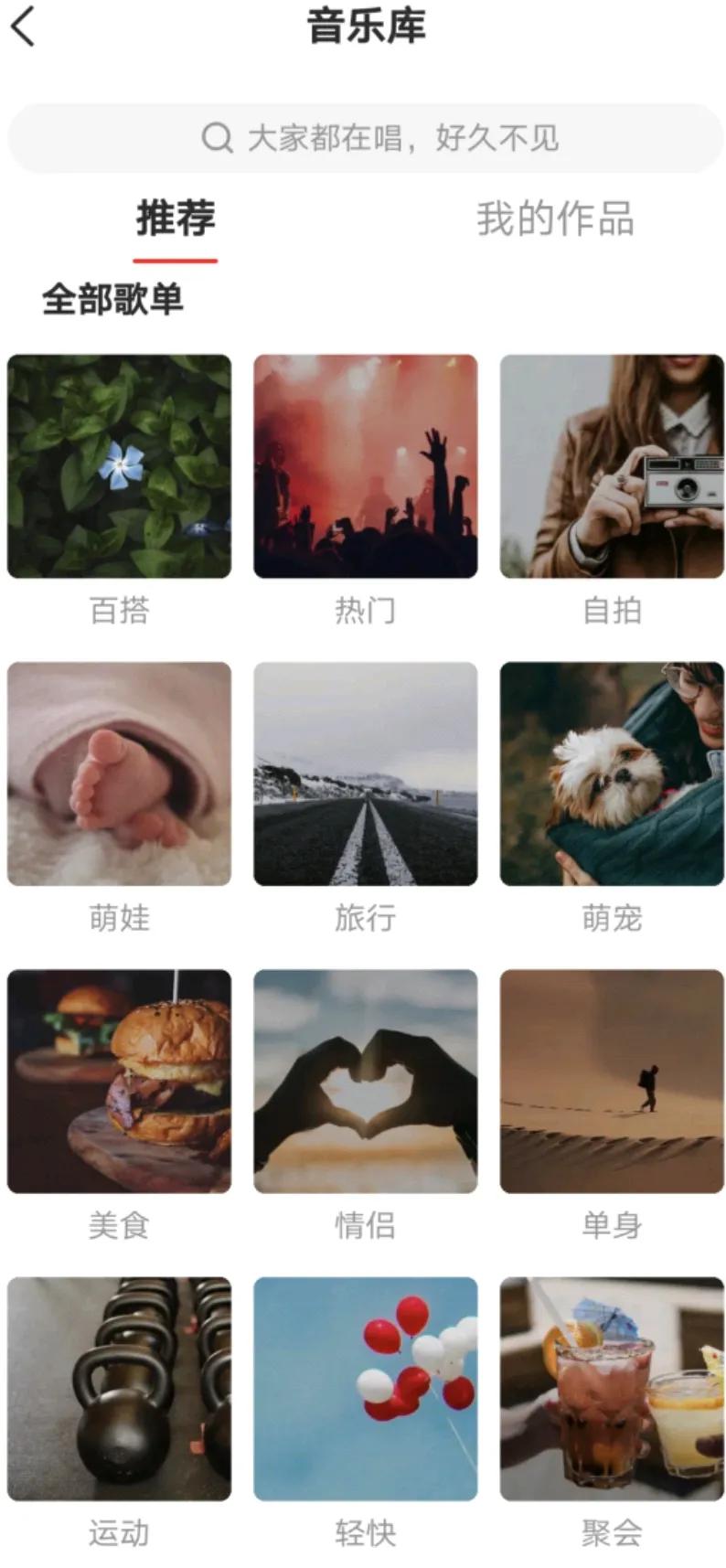 “音乐短片”功能最让小编感到惊喜的是“音乐”部分的优化。在这里,友友们可以直接使用自己演唱的作品作为短片的背景音乐。和之前不同的是,在这个新功能中,友友们不必先录完歌曲才能进入到影像素材选择步骤,而是可以在音乐库里随心选择自己之前演唱过的歌曲作为BGM。此外,全民K歌还贴心地准备了17种主题歌单,即便友友们没有自己录制作品,也可以根据影像风格和当时的心情在系统里选择歌曲,为每一段影像找到最适合的BGM,分分钟打造你的专属MV。